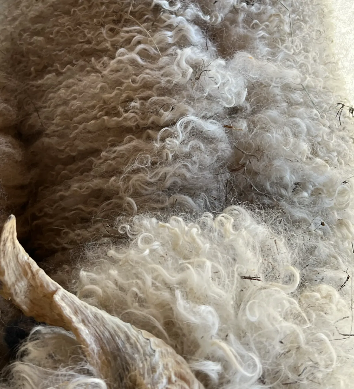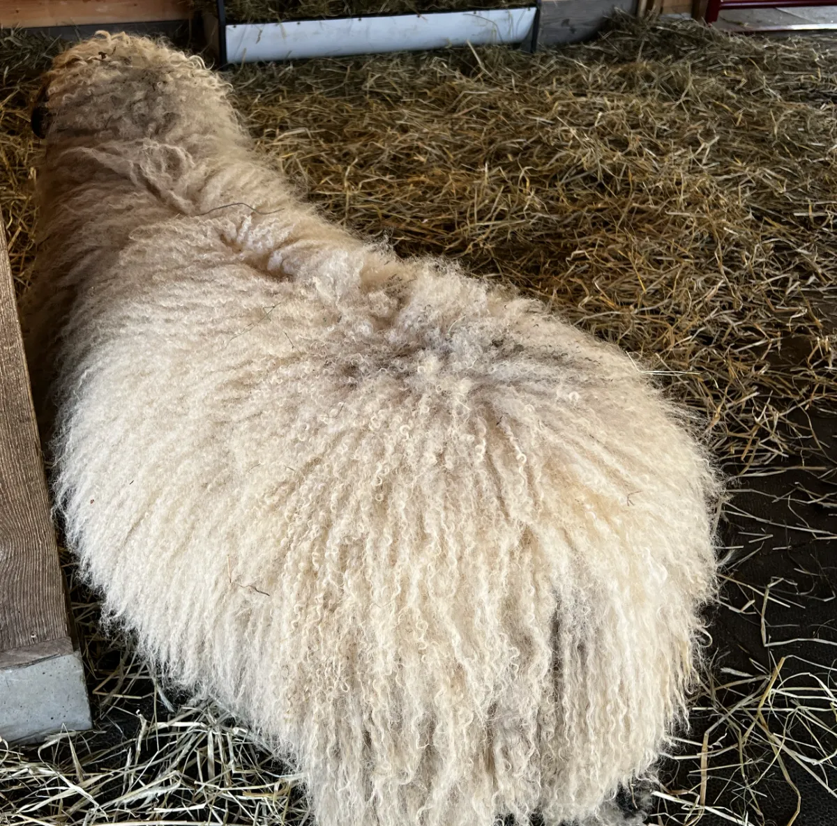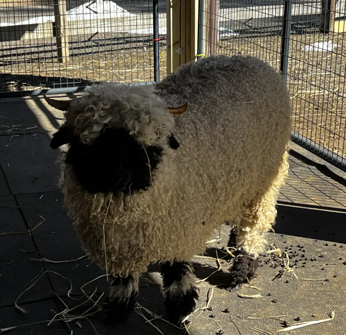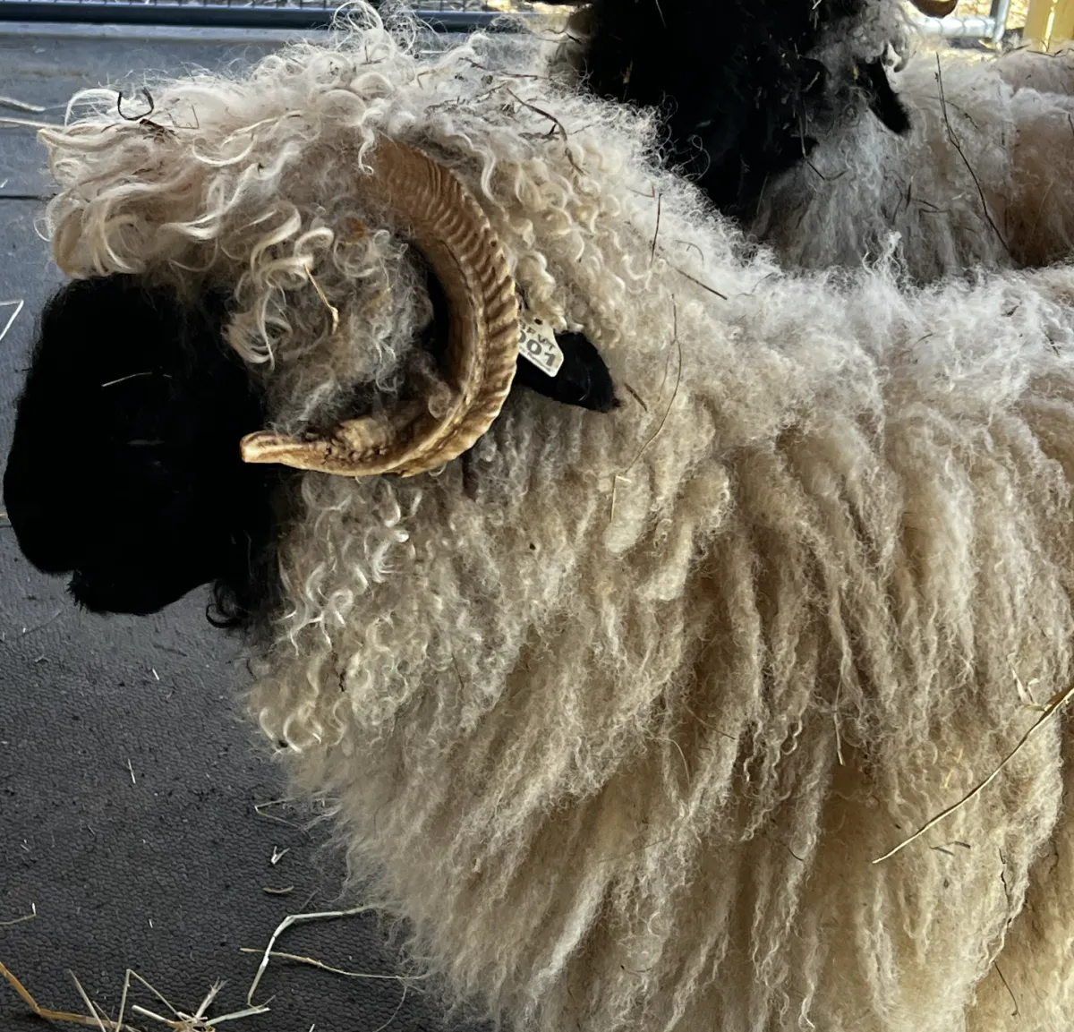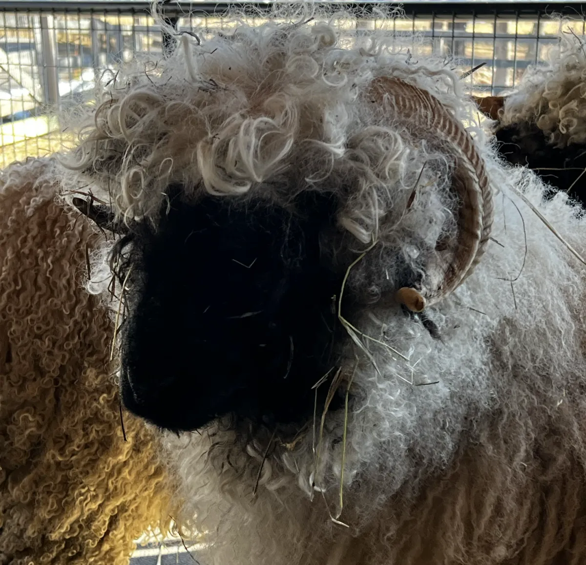 Ian is an F5 Valais Blacknose Ram born on April 29th, 2025. He's friendly, curious, walks easily on a leash, and has the most beautiful curls and coat. This will be his first season as one our breeding rams, and he is available if you want that adorable traditional face, correct markings, a coat that doesn't collect every speck of straw, and gorgeous well placed horns!